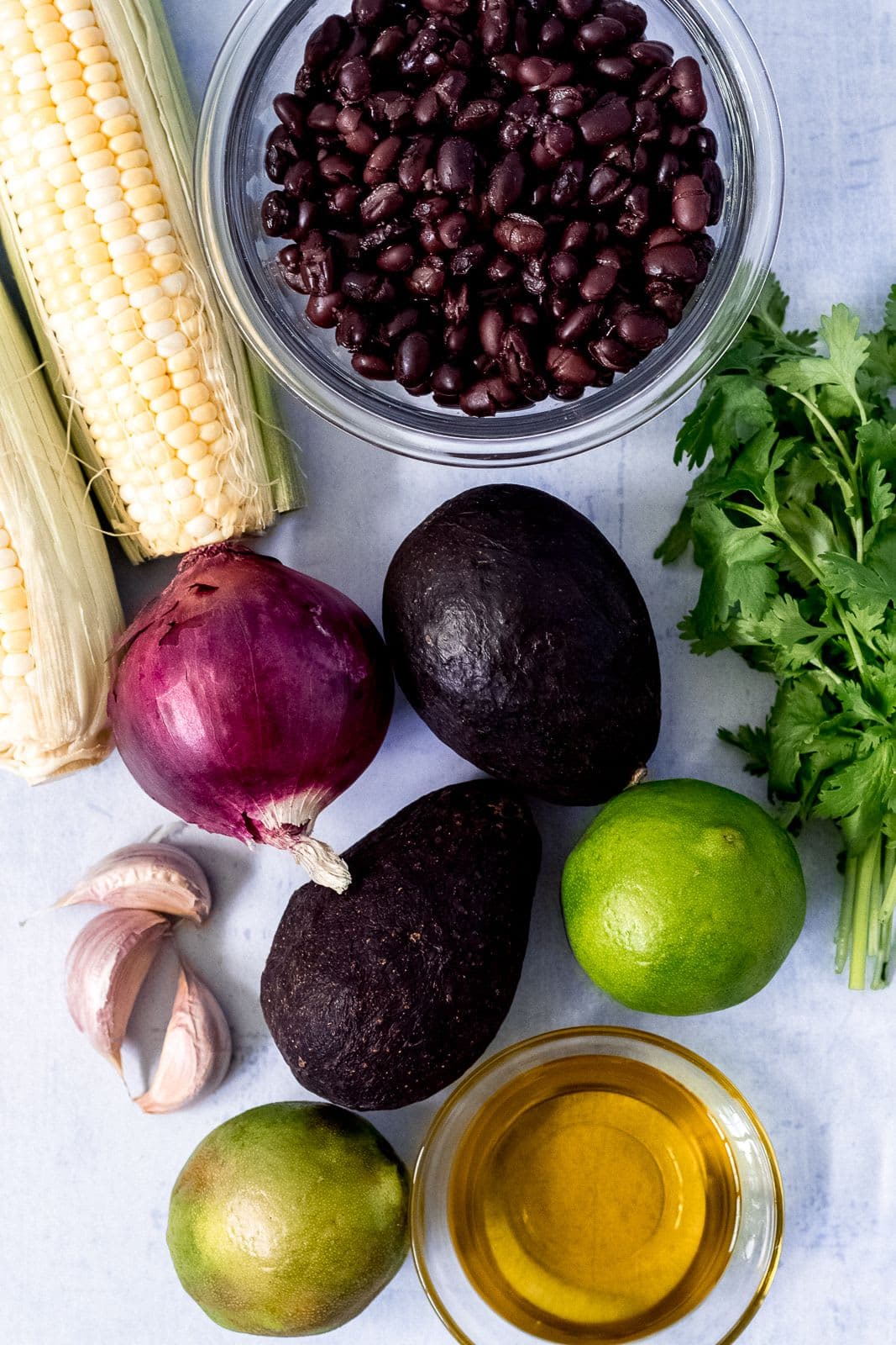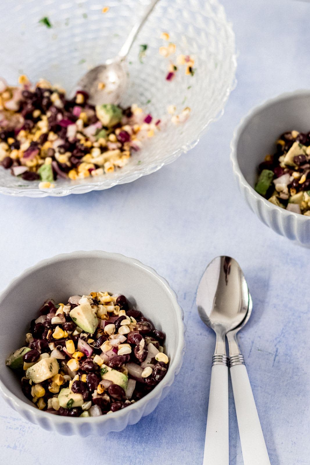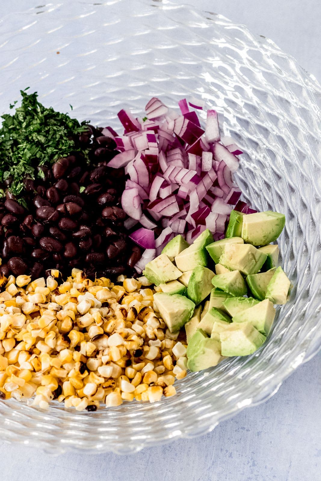 In a large salad bowl, add the black beans, grilled corn kernels, onion, avocados and cilantro. Pour dressing on top and mix to combine. Taste and add more sea salt if needed.