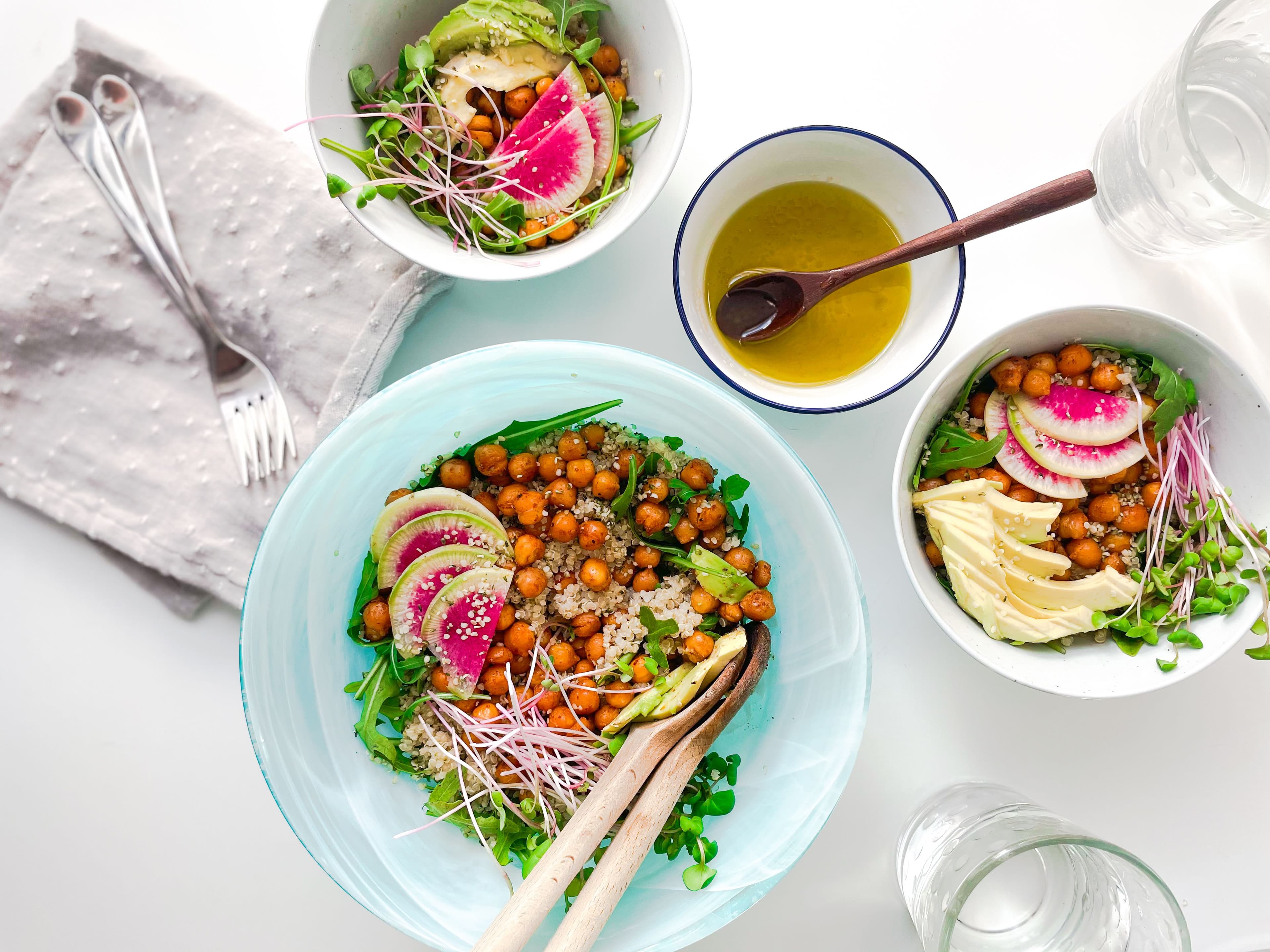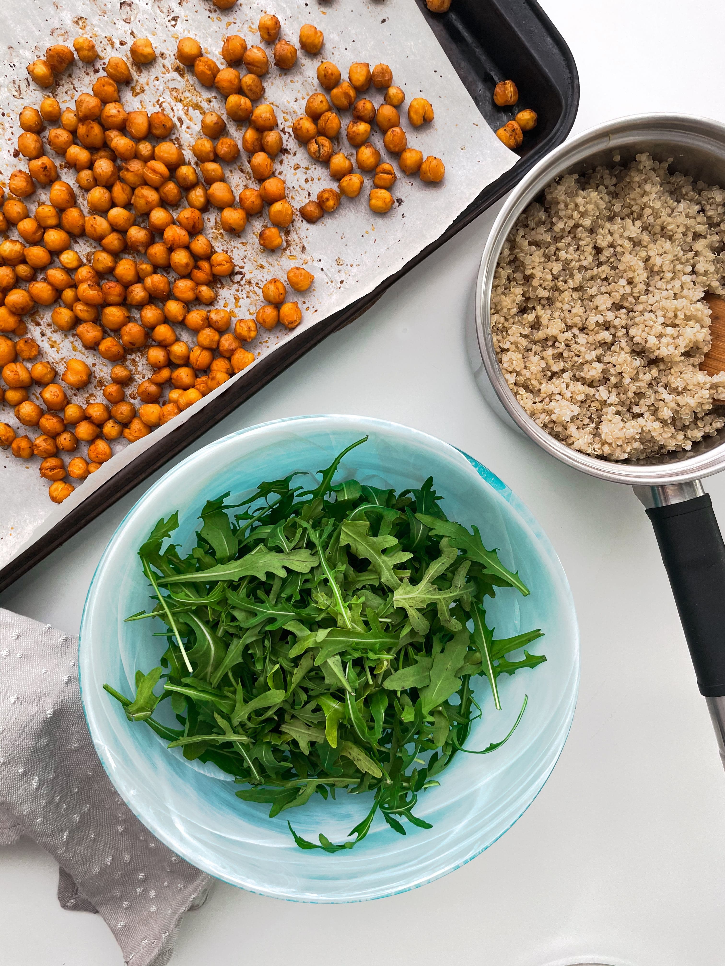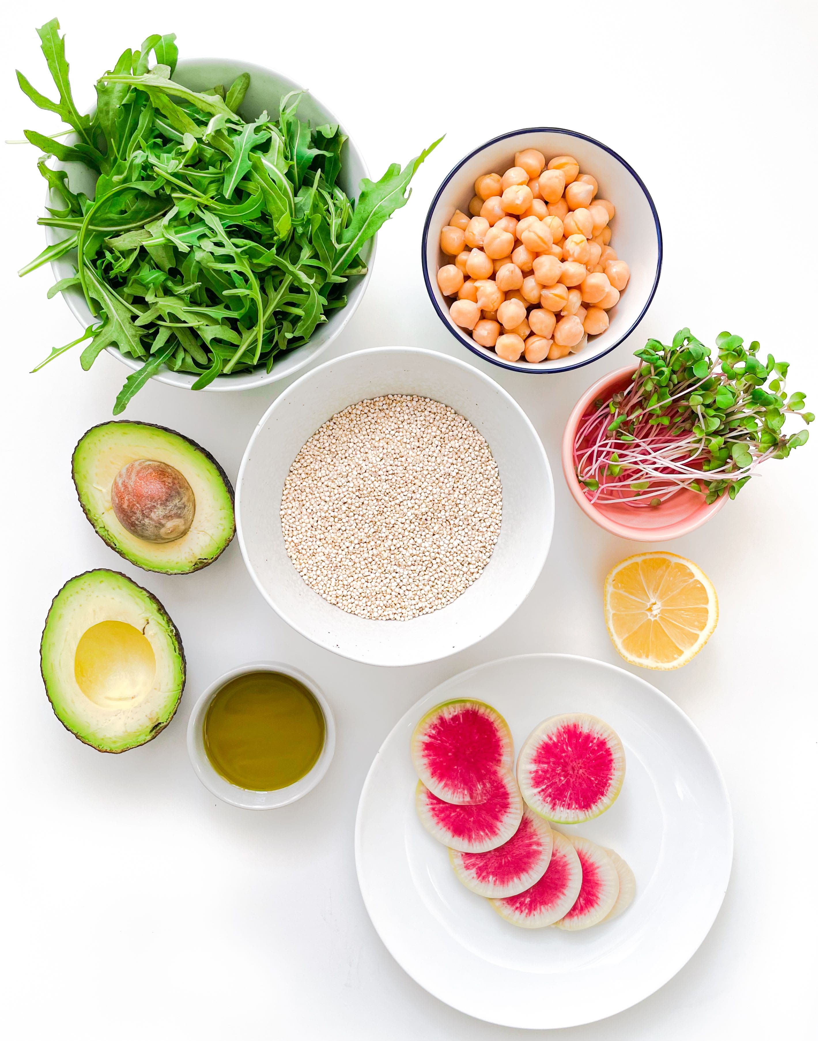 ASSEMBLE: the salad by tossing the arugula together with the quinoa. Top with the avocado, hemp seeds, watermelon radish, roasted chickpeas and microgreens. Toss with dressing when ready to serve.