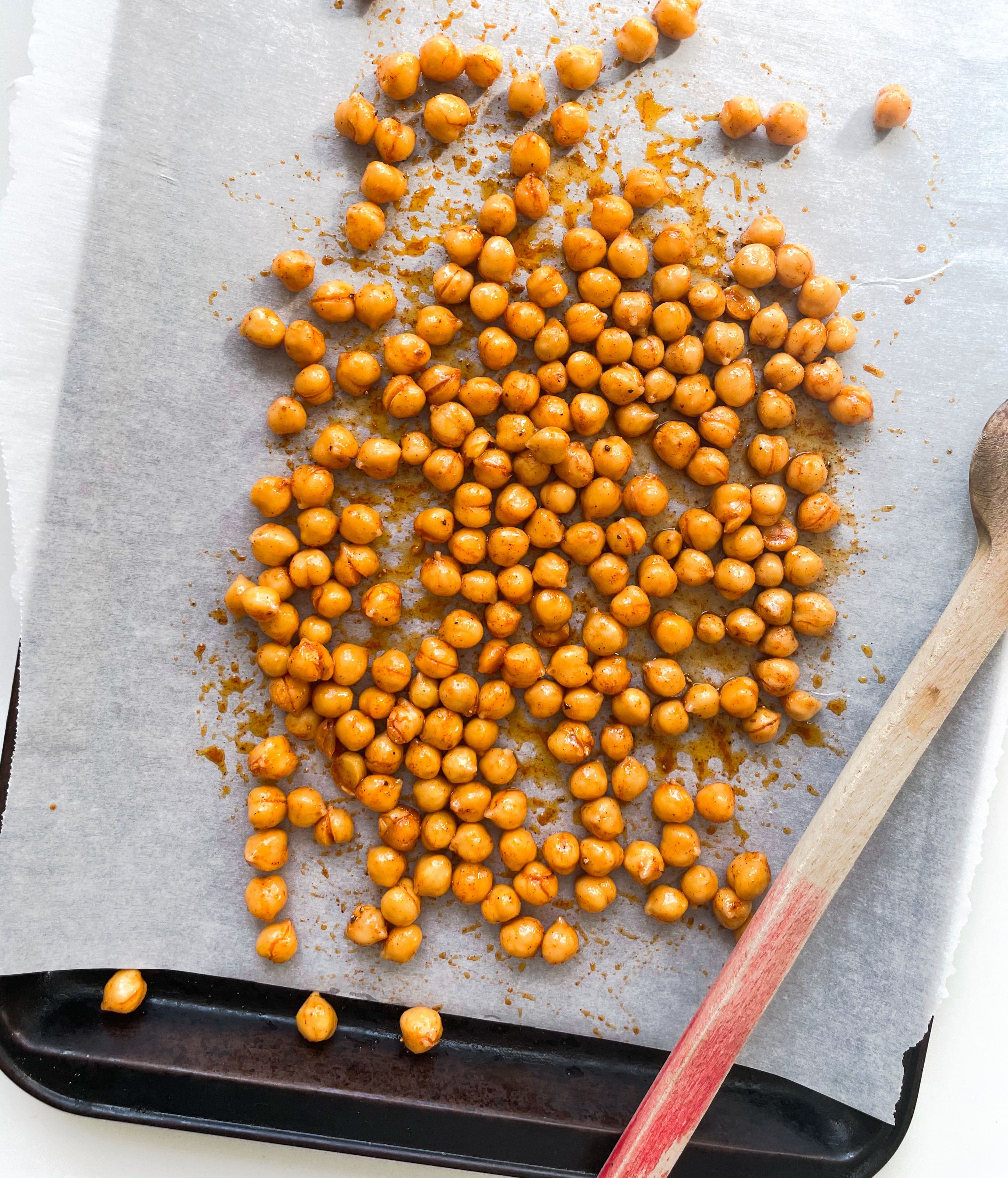 MIX: Your chickpeas, ½ tsp of olive oil, paprika, garlic powder, cumin, ¼ tsp salt and 1/8 tsp of black pepper together in a bowl. Spread out evenly on the baking sheet and roast for 25 minutes or until slightly crispy.