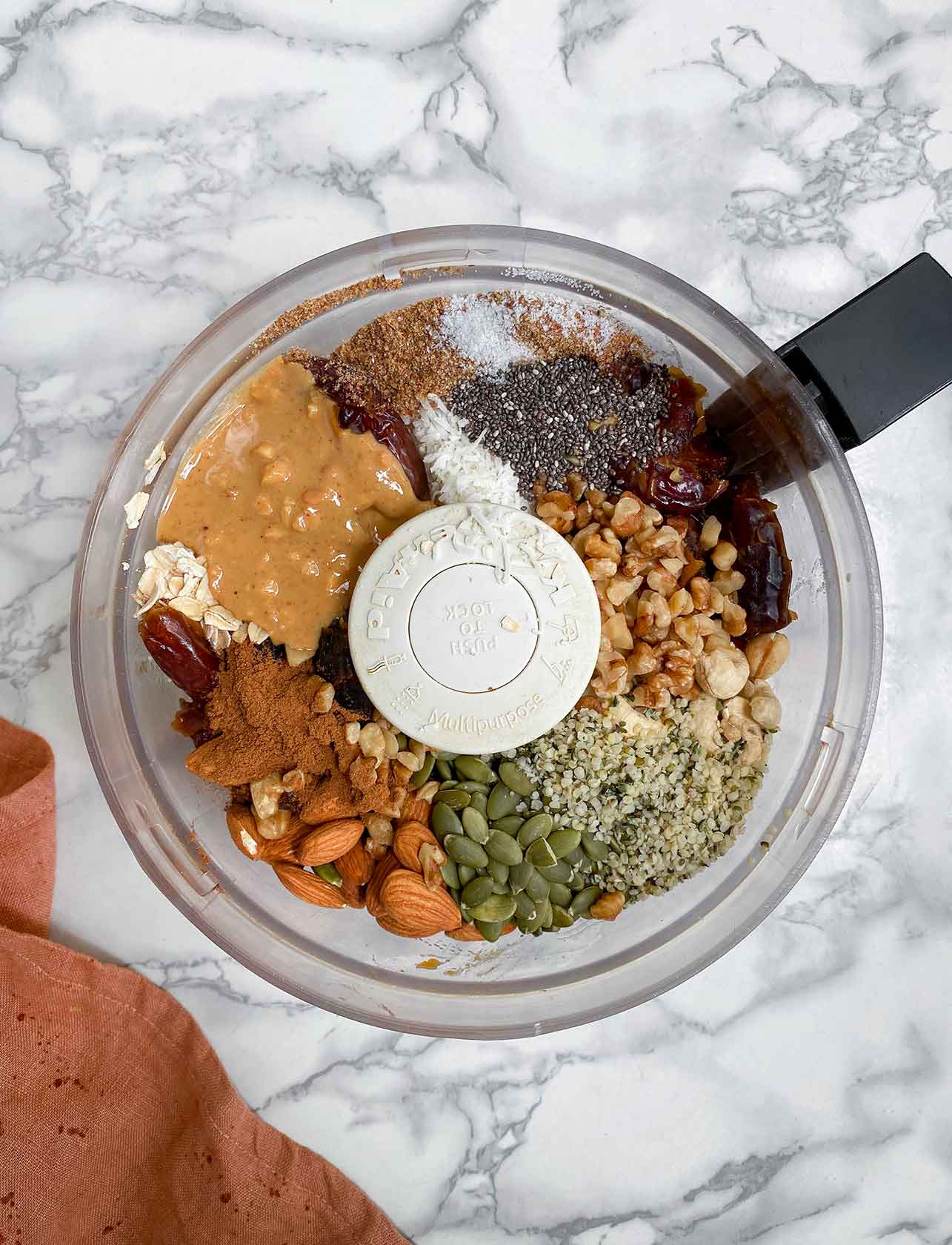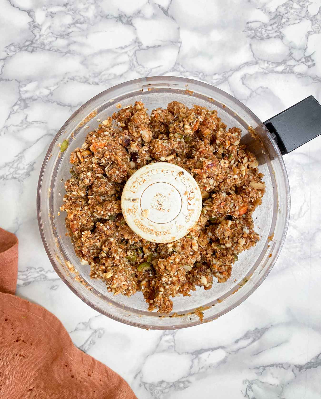Place all ingredients into a food processor and pulse and process until the mix starts to create a crumbly batter. You may have to stop and scrape the sides down a couple of times to make sure everything mixes and combines together.